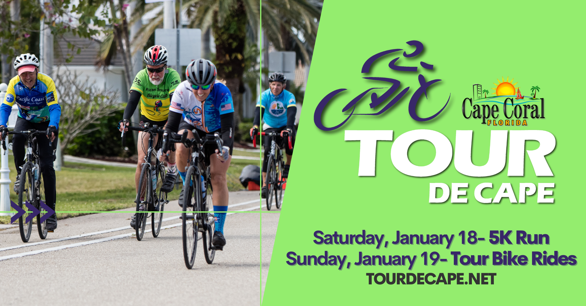 The Cape Coral Parks and Recreation Department is proud to host the 35th Anniversary of Tour De Cape! The event includes a 5K, a Mini Kids Ride, and 15-30-62-100 mile bike tours in the northwest and southwest regions of Cape Coral.