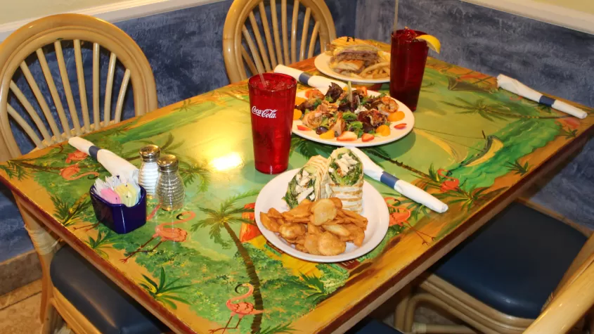 The Blue Giraffe is the place to experience casual island dining for breakfast (served till noon daily), lunch and dinner, seven days a week from 7am - Close.  Dine outside in the garden atmosphere of Periwinkle Place or inside at hand-painted tables, inspired by local artists.  Our wide-ranging new menu is full of fresh and local seafood, island-renowned chowders, custom sandwiches and burgers, refreshing salads, mouth-watering steak and vegetarian options.  With a full liquor bar, relax and enjoy a tropical beverage where we are head & shoulders above the rest!